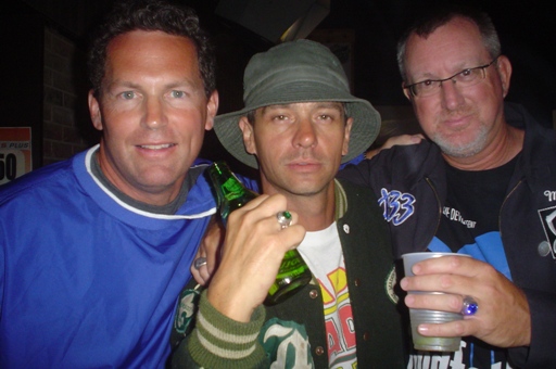 Mac McEntire, Renegades viz, Madison Scouts ’88 viz, on right, with two Madison Scouts Alumni, Stadium Club after 2006 Madison DCI Semifinals (Photo by Cozy Baker)