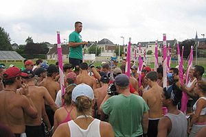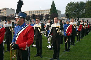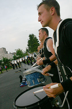 Under a beautiful blue sky Monday morning, the members awoke at the sports hall prepared for an ordinary day of drum corps rehearsal and an evening performance. Having transported the corps overseas, many things are far from what we’d call "ordinary" in drum corps. But with five days under their belt in this provincial French city, the corps has adjusted quite well with the local people, customs, and languages. Members and staff have had some time to check out life here in Saint Quentin a bit, as the French have also had the opportunity to check out life with the drum corps. Even some of the local kids keep popping in the corps hall to say "Hallo!" and pop back out. The more adventurous ones head towards the rehearsal field.