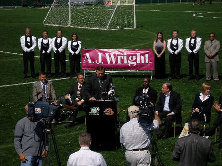 Greater Rochester Visitors Association President Ed Hall addresses local officials at PAETEC Park and welcomes Drum Corps Associates representatives Fred Windish and Allen Buell (left) plus Empire Statesmen Drum Major David Bruni and several corps members (background).