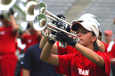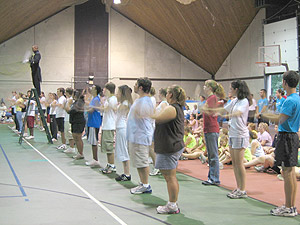 After dinner, the corps prepared for the final clinic of the day – a full-blown ENTERTRAINMENT clinic with all of the FJM Clinic attendees – and a few fans mixed in, too! Members switched from red shirts into full uniform, but as the clouds appeared more and more ominous, they opted to move the clinic indoors. It couldn’t have been a neater setting for a clinic! When the GLASSMEN broke into sections for the technique part of the clinic, it was like a three-ring circus, where you could run around and catch whatever group caught your fancy! The echoes in the fieldhouse were definitely overpowered by the brilliant brass and percussion features – with flying colors from the guard to boot.