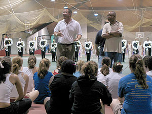 Brass staff member John Davis and caption head Frank Williams work with musicians at the clinic.